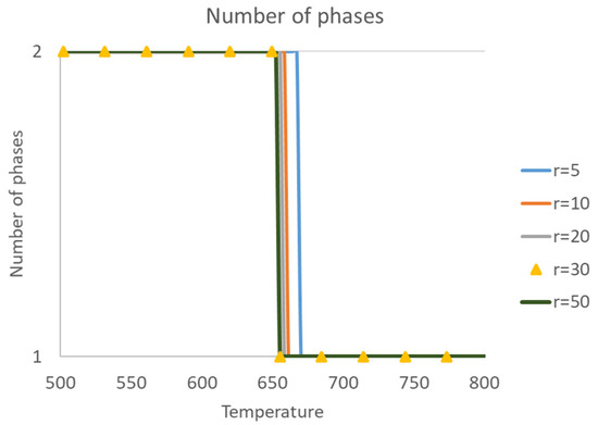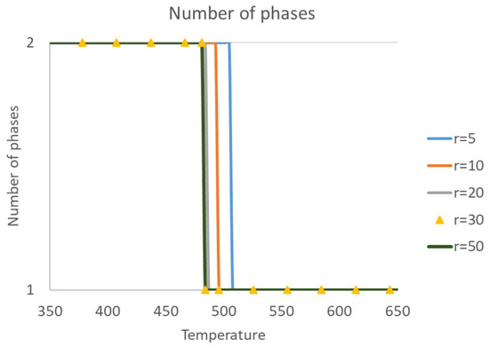 Number of phases at equilibrium changing with temperature under the constant overall mole concentration as 429.65 mol/m3.