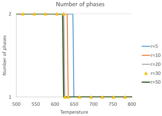 Number of phases at equilibrium changing with temperature under the constant overall mole concentration as 10 mol/m3.
