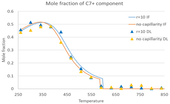 Except for the phase stability test, the phase splitting calculation is also needed prior to the multi-component multi-phase flow simulation, to provide thermodynamically consistent initial compositional phase distributions. The deep learning predictions on the phase splitting calculations are illustrated in Figure 7 and Figure 8, taking the mole fractions of C1 component in the vapor phase and the C7+ component in the liquid phase as the example, respectively. The accuracy of the trained deep learning model has been verified again by the acceptable variance from the ground truth data. It can also be referred from the plotting that the compositional phase distributions change with the increasing temperature, while only the vapor phase can be detected in the mixture at equilibrium above certain temperatures. This capture of phase transitions meets well with the previous finding on the phase stability test, as shown in Figure 3. Meanwhile, the effect of capillarity can also be detected on both the phase transitions and compositional distributions, and it is proven again that the consideration of capillarity may result in a larger two-phase region as a higher phase transition temperature is needed.
