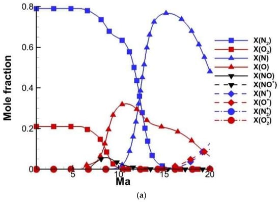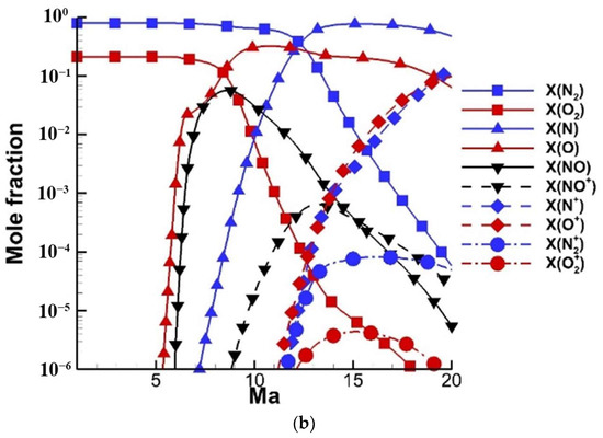 Zero-dimensional simulations are performed for the N2–O2 mixture with initial mole fractions of 0.79 and 0.21 under the constant pressure of 1197 pa and constant temperature of 226.5 K, which is consistent with the conditions at an altitude of 30 km [27]. The mole fractions of the species behind a normal shock wave varying with a Mach number from 1 to 20 are shown in Figure 2. The dominant species are shown in Figure 2a with a linear axis. The dissociation reaction of N2 and O2 initiates at approximately Mach 7, where the NO and O are produced, while the production of species N starts at about Mach 9. The peak mole fractions of species NO, O, and N occur at about Mach 9, 10, and 15, respectively. As the Mach number further increases, the decrement of the mole fraction is due to the dilution by rapidly produced N and O for the species N, and consumption to ionization reactions for the species O and N. Non-ionized species O2, N2, O, N, and NO mainly exist when the Mach number is lower than 16, while ionized species O+ and N+ are considerably produced as the Mach number increases. The mole fraction is also given with the logarithmic axis in Figure 2b. When the Mach number is greater than 12, the ionized species N+, O+, N2+, and O2+ are significantly produced, while the mole fraction of N2+ and O2+ is still small (10−4 order). It is important to mention that the temperature is practically lower in the real flight environment than the simulation under the same Mach number where the mole fraction of ions is smaller, which is caused by the non-negligible heat absorption effect of chemical reactions.