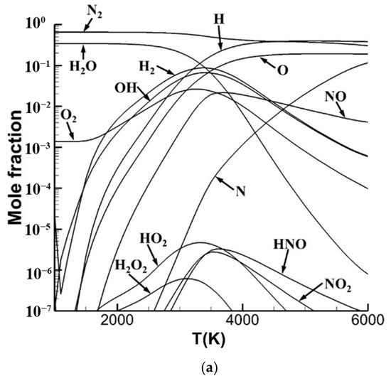 Attention has widely been paid to the performance of air-breathing hypersonic vehicles and their propulsion systems in recent years [1,2,3,4]. Since increasing flight speed is one of the primary objectives, the accurate prediction of the crucial aeroheating environment where the dissociation and ionization of air species due to the effect of high temperature is necessary to be considered. In the combustor of the propulsion system, generally powered by a scramjet engine, the oxidant for the injected fuel is practically the mixture of the products or intermediates of high-temperature air chemical reactions rather than the hypothetical non-reactive N2–O2 mixture in previous investigations. In this case, a hybrid kinetic scheme considering both high-temperature air reactions and combustion reactions is necessary to be modeled.