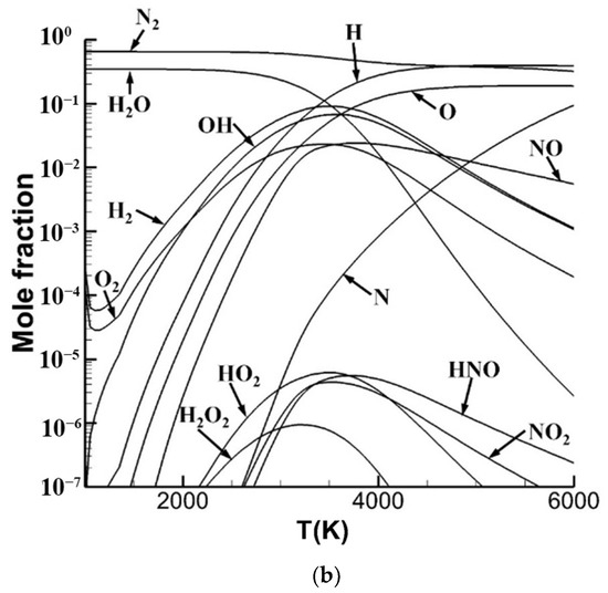 The temperature of the combustion flow in the combustor under working conditions is 1000 K~2500 K, while the temperature of the ambient of fuel jet is locally up to 4000 K~6000 K. Therefore, the temperature range of 1000 K~6000 K is mainly focused for the combustion species. The steady-state combustion with a chemical equivalent ratio of H2–air mixture under the constant pressure of 1 atm and 2 atm varying with the temperature is investigated, and the mole fractions of the products are shown in Figure 3. The mole fractions of H2O2, HO2, HNO, and NO2 are less than 10−5, which is neglected in the hybrid kinetic scheme. The mole fractions of NO and N are relatively higher, especially when the temperature is higher than 3000 K, which indicates that the effect of the nitrogenous products performs significantly on the combustion and coupled with the influence of nitrogenous species produced in high-temperature air reactions.