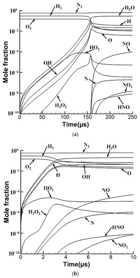 To ensure the reasonableness of the neglection of the trace species in the steady-state combustion, which might be the active species to influence the combustion, unsteady-state combustion under the specific temperature of 1000 K and 2000 K is also performed, where the evolution of the mole fraction of species is shown in Figure 4. The mole fraction of H2O2 and HO2 is less than 10−4, and the mole fraction of HNO and NO2 is less than 10−8, which is consistent with the result of the steady-state combustion, where the effect on the ignition and combustion is negligible. In addition, the increment of trace species is after the ignition illustrated by the peak mole fraction of OH, which further indicates the reasonableness of the neglection.
