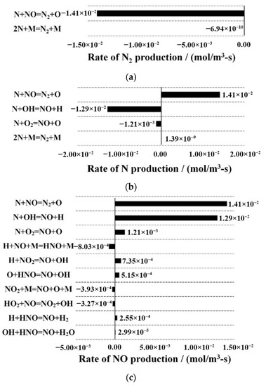 Production rate of dominant nitrogenous species of different reactions. (a) Production rate of N2. (b) Production rate of N. (c) Production rate of NO.