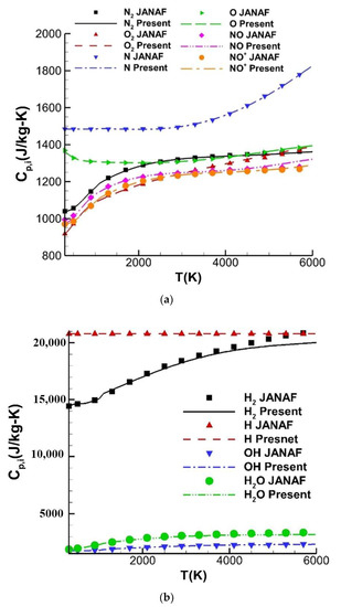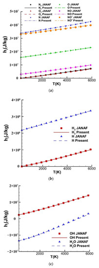 The thermodynamic properties proposed by Gupta [12], where the temperature ranges from 300 K to 15,000 K, are employed for the high-temperature air species (O2, N2, O, N, NO, NO+, e−) of the hybrid kinetic scheme, and the thermodynamic properties published by Esch [43] are utilized for the combustion species (H2, H, OH, H2O). The verification is carried out by comparing with the data of the NIST–JANAF database [44], where the specific heat at a constant pressure and the specific enthalpy consist well with the reference as shown in Figure 6 and Figure 7, respectively.