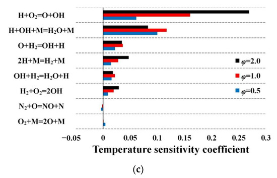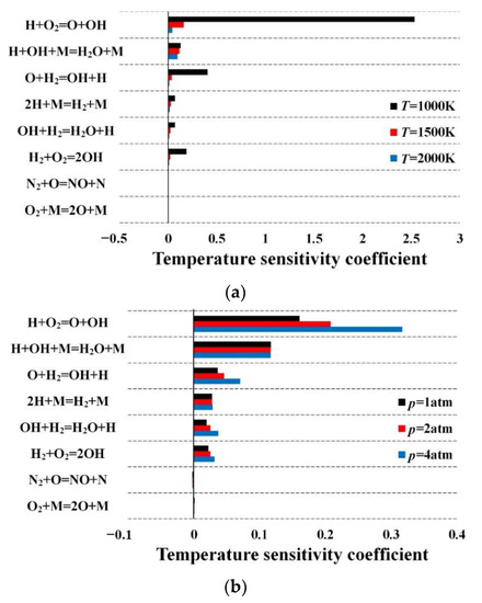 The sensitivity coefficient is calculated for specific temperatures (1000 K, 1500 K, 2000 K), pressures (1 atm, 2 atm, 4 atm), and equivalence ratios (0.5, 1, 2). The reactions with the first eight greatest sensitivity coefficients are shown in Figure 8 successively, where the reactions with the positive sensitivity coefficient indicate the enhancement of the combustion. The same reaction equations with a consistent sequence are obtained. The chain-termination reaction H + OH + M = H2O + M and chain-amplification reactions H + O2 = O + OH and O + H2 = OH + H are illustrated to be the dominant reactions, which is consistent with the regulation of the chain reactions [28,37]. The production of free radicals increases as the initial temperature decreases or the initial pressure and the equivalence ratio increase.