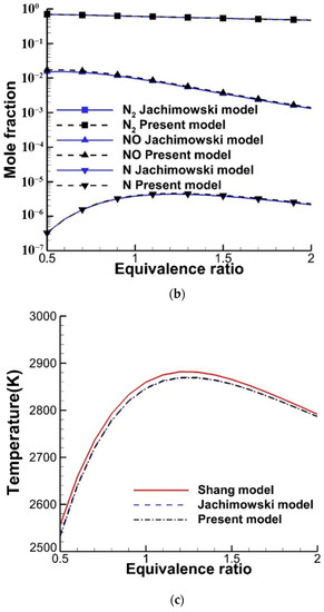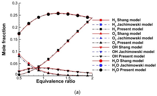 The hybrid kinetic scheme is also employed for the steady-state combustion calculation at an initial temperature of 1500 K and pressure of 1 atm to validate the reliability of the combustion characteristics. The mole fraction of the species and steady-state temperature varying with the equivalent ratio are shown in Figure 10. The results show great agreement between these three kinetic schemes. Despite the reaction rate coefficients of the nitrogenous reactions of the Gupta scheme and the Jachimowski scheme listed in Table 6 being unequal, similar results are obtained due to the mole fraction of nitrogenous species being relatively lower, which indicates the reasonableness and reliability of the hybrid H2–air kinetic scheme.