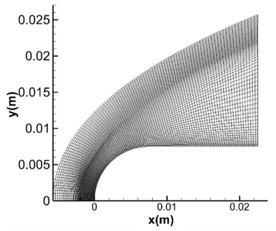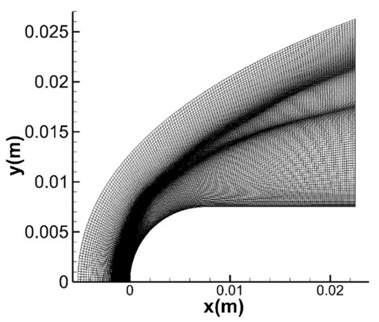 The simulation of the shock-induced sub-detonative combustion is performed for a semi-sphere with a cylinder body, where the diameter is 7.5 mm. The number of nodes along the wall and in the direction perpendicular to the wall of the structured mesh is 100 and 70, and the cells are clustered at the bow shock wave as shown in Figure 11. The axisymmetric multi-species Euler equations are solved. The adiabatic, non-catalytic, no-slip condition is applied to the wall. The non-reflection condition is applied to the far-field. The detailed parameters of the mainstream are listed in Table 7, where the Mach number, pressure, temperature, and mole fractions of the species are given.