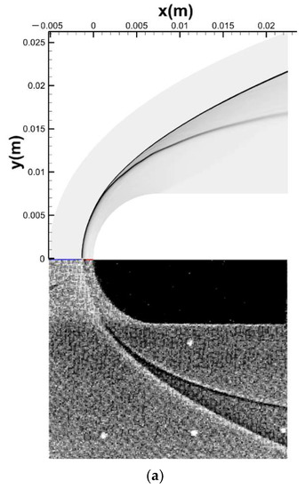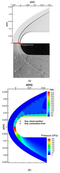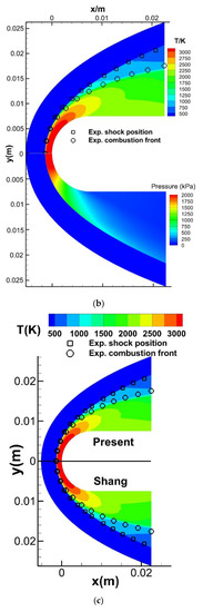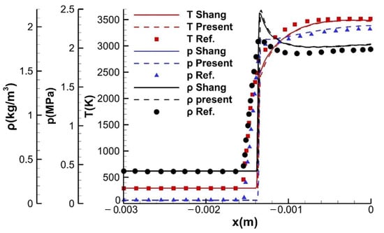 The temperature distribution of the present scheme is given compared with the schlieren image of the experiment [45] as well as the result of the Shang scheme as shown in Figure 12. The non-coincident bow shock wave and combustion front are clearly captured, which, due to the velocity of the H2–O2 detonation (2550 m/s), are greater than the velocity of the mainstream (1892 m/s). Great agreement of the bow shock wave and combustion front is presented by the two numerical results as well as the schlieren image, except for the combustion front of the experiment being slightly expanded close to the outlet of the computational domain.