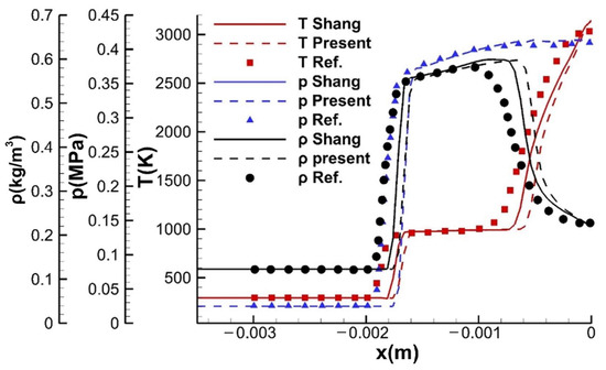 The distributions of the pressure, temperature, density, and mass fraction of the species along the stagnation line are also compared with the result of the Shang scheme and published reference [46] as shown in Figure 17 and Figure 18, respectively. A pressure peak and a density peak, namely the Von Neumann peaks, are presented behind the combustion front due to the massive heat-releasing caused by the violent combustion with fast combustion reactions, which makes the remaining energy insufficient to maintain the strength of the combustion near the wall, where the pressure and density decrease. Perfect agreement is obtained between the results, which also indicates the accuracy and reasonableness of the proposed hybrid kinetic scheme.