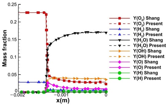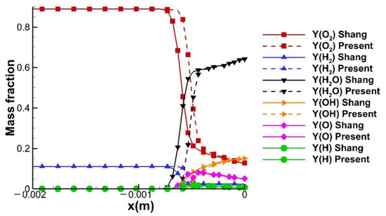 The distributions of the pressure, temperature, density, and mass fraction of the species along the stagnation line are also compared with the result of the Shang scheme and published reference [46] as shown in Figure 13 and Figure 14. The location of the bow shock wave and combustion front obtained by the present scheme is slightly closer to the wall, which is because the relatively slower reaction rates result in a longer induction time of the combustion. Despite the small differences between the results, the trend and maximum values of these parameters consist well, which indicates the accuracy and reasonableness of the proposed hybrid kinetic scheme.