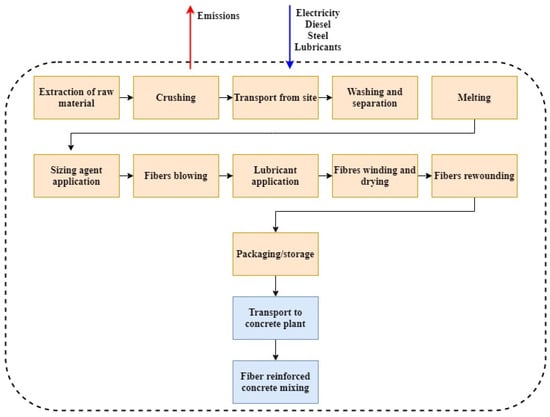 The understanding of the environmental footprint of used materials becomes a very important issue contributing to the sustainable development principles adopted within modern building materials design [19]. In this regard, a robust environmental assessment such as Life Cycle Assessment (LCA) is utilized in order to determine the impact of material processing and serves as a tool for the identification of suitable components [20]. The robustness and widely standardized methodology of LCA predetermined its use for benchmarking various materials, including building material components. Taking into account the environmental footprint of building materials, the utilization of basalt fibers as a concrete reinforcement is widely presumed to be a prospective solution [21]. Notwithstanding, the overall impact needs to be discussed in a broader perspective to follow the sustainability principles similarly to the previously described environmental impacts of glass and carbon fiber-reinforced [13]. Unlike carbon or steel fibers, reliable datasets describing the environmental load associated with basalt fiber application are lacking in the available literature, and only a few pioneer works can be identified. Therefore, an understanding of the environmental impact associated with basalt fiber reinforcement needs to be provided in order to allow advanced comparison and responsible selection of individual concrete mixture constituents [22,23,24].