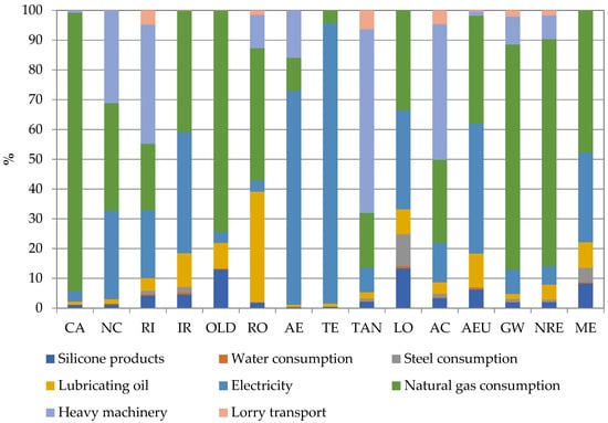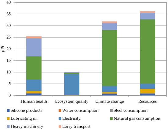The normalized endpoint level impacts represented by human health, ecosystem quality, climate change, and resources are shown in Figure 3. Looking at the results at the endpoint level, the most intense consequences consist of natural gas combustion across all categories except Ecosystem Quality. This endpoint category suffers mostly from electricity consumption. Significantly lower environmental load is related to the use natural fibers, which in recent years attracted eminent attention due to lower requirements on material processing. This issue was studied by Zhou et al. [38], who concluded substantial environmental savings by the replacement of glass fibers by kenaf fibers. However, the differences in the functional properties of basalt fibers such as long-term stability, durability, and high-temperature resistance render it impossible to provide an unambiguous comparison of various fibers and at the same time refer to the need to use a multi-criteria assessment that could cover more than just environmental factors [16,39]. In this regard, Chen et al. [18] questioned the benefits of natural fibers due to large amounts of epoxy resin, which nullified the advantages of natural fiber compared to carbon fibers.