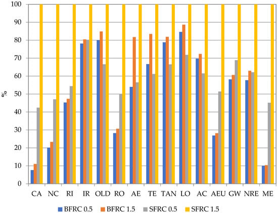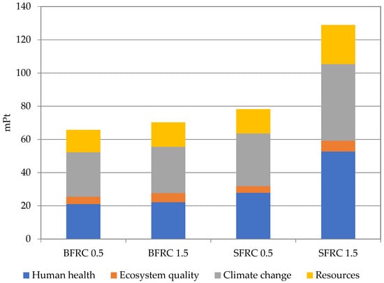 The results at the endpoint level correlate with the above-mentioned findings as depicted in Figure 4. As shown, all endpoint impact categories were influenced proportionally, while the single score index point to the lowest environmental load associated with BFRC 0.5, followed by BFRC 1.5 and SFRC 0.5. Mixture SFRC 1.5 revealed significantly worsened values, which were almost twice high as BFRC 0.5.