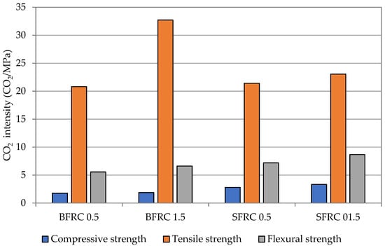However, the separate evaluation of functional environmental performance does not provide a comprehensive overview of material performance in terms of sustainable measures. In this regard, a combined environmental/functional assessment takes place, and thereby more reliable and thorough insights can be found. With the help of the presented results of Jabbar et al. [15], the following indexes (see Figure 6 and Figure 7) can be presented, and crucial findings can be formulated. As is evident, the eco-efficiency of all of the studied mixtures gradually increased in line with the shift in reinforcement dosage. Here, the “environmental costs” per MPa for flexural and compressive strength were lowest for BFRC 0.5, followed by BFRC 1.5. In other words, the utilization of basalt fibers represents a viable solution with sufficient functional performance and reduced environmental costs in comparison to a conventional solution. On the other hand, the noted drop in tensile strength observed for BFRC 1.5 diminished the environmental viability of this mixture. Similar trends were also observed for the CO2 intensity index. The quite low CO2 emissions are related to the functional parameters of concrete reinforced by basalt fibers, which is almost half in case of the compressive strength. The undesired drop in the tensile strength of basalt mixtures is due to the limited capability of basalt fibers to redistribute the stress; therefore, even more favorable environmental performance cannot balance the loss in tensile strength [24]. The energy/mechanical index accessed by Zhang et al. [38] refers to the favorable results of basalt fiber reinforcement over carbon fibers. In this regard, the application of basalt fibers as a concrete reinforcement can be viewed as favorable options contributing to extended material performance and concurrently contributing to sustainable goals. The comparison of reinforced façade panels studied by Laiblova et al. [11] reveals the environmental benefits associated with basalt reinforcement use; however, the authors did not provide the source of input data used for particular reinforcement assessment. In this sense, the provided results cannot be clearly compared with regard to possible differences in the production methods of basalt fibers [35].