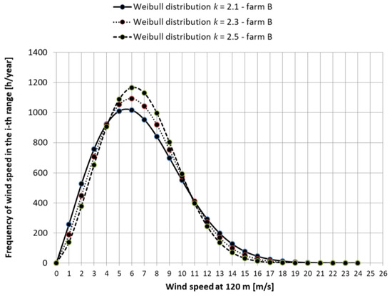 The objective of the conducted study was to select the wind turbine allowing obtaining the maximum economic result for the investment based on available annual wind measurements. Two locations for the wind farms were taken into consideration by the study, referred to as farm A and farm B, each with 120 m high wind turbine. Considering the available wind results at heights lower than the designed height of wind towers, the analyses were carried out in variants. The wind speed increases with height [33]. On the bases of the available data, the mean of the wind speed at 120 m height above the ground was calculated. The wind distribution was determined according to the Weibull probability density function [16] for three values of the k shape coefficient. Value of the A scale parameter was calculated on the basis of the mean of the wind speed and the selected k shape coefficient. Turbines with horizontal axis of rotation and nominal power of 2.0, 2.3 or 2.5 MW were selected. Table 1 lists wind turbines selected for the analysis.