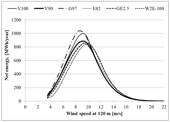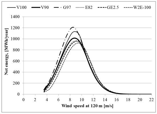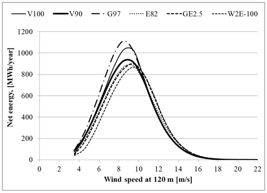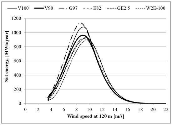 The choice of the proper equipment is made on the bases of the measurement results and the characteristics of the wind turbine productivity. The device manufacturer demonstrates the relationship between the turbine power output and wind speed. However, data for different air density values are rarely presented. The device characteristics further includes information on the start speed of the turbine, nominal power output and maximum wind speed resulting in device shutdown. The selected turbines have similar starting wind speed of 3.5 m/s. All of them shut down when the wind speed exceeds 25 m/s. The wind speed did not exceed 24 m/s in the selected locations, therefore turbine shutdown did not influence outcomes of the presented analyses. The Pwe_i for wind speed , being the middle of subsequent class ranges, can be estimated based on the characteristics of wind farm performance. Then, the Ewe_i energy can be calculated, generated by the wind farm for one year in i-th class range [23]: