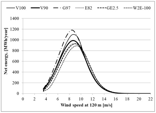 The present study demonstrated the manner in which wind turbine is selected on the basis of recorded annual wind measurements, with the emphasis on the obtaining the maximum financial benefits. The wind measurements demonstrated applicability of the tested locations in terms of their use as the construction site of a wind farm. Six types of wind turbines with different power outputs were tested. Turbines ensuring best usage of the wind energy resources in the studied locations have been indicated. Considering the hourly distribution of individual wind speeds, 2 MW turbines turned out to be the most energy efficient. The turbines with nominal power output of 2.3–2.5 MW demonstrated poorest performance in the tested locations.