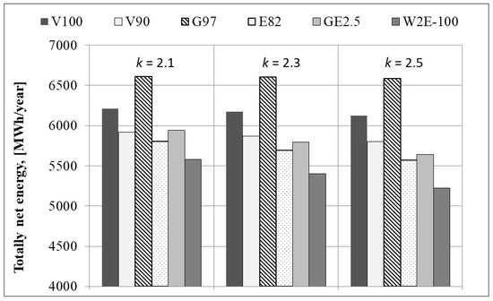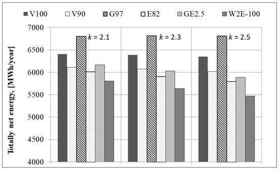 Table 4 lists performance coefficients of the analyzed wind turbines depending on the assumed k shape coefficient. The energy performance coefficient is the quotient of the actual annual production and the technically possible maximum energy production of a wind turbine. It should be noted that the wind turbines are not designed to maximize the energy performance coefficient, but rather to generate the highest possible power at determined wind speeds. Performance coefficients of 30–40% are considered very high in coastal areas.