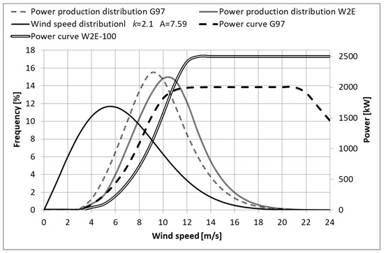 Analyses discussed in the Section 3 allowed obtaining data concerning the performance of the selected wind turbines. The G97 turbine turned out to be a clear leader in the studied locations. It generated the highest amount of energy that was supplied to the power grid, independently of the shape parameter k. The lowest productivity in the tested locations was demonstrated by the W2E-100 turbine. Figure 12 and Figure 13 demonstrate Weibull distribution and power production distribution, as well as power curves for the G97 and W2E-100 turbine. Data analysis indicates that the W2E-100 turbine attains its maximum power output at 13 m/s wind speed. This is considerably beyond the maximum power production capacity in the selected locations. The G97 attains the maximum power output for the wind speed of 11 m/s, which enables it to achieve higher performance.