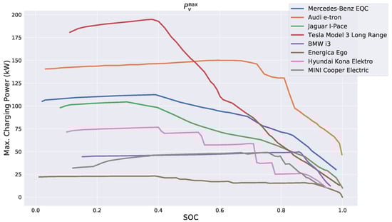 We consider eight different types of real EVs shown in Table 1. The EV’s battery capacities were taken from the EV Database https://www.ev-database.de (accessed on 11 November 2021). The respective maximum power functions were manually extracted from plots found on the website of the Dutch EV charging station operator FASTNED https://fastnedcharging.com (accessed on 11 November 2021). More specifically, 25 up to 70 points of a plot were manually determined in dependence of notable changes of the gradient, and linear interpolation was applied in between. All these functions are shown in Figure 3. Observe that the maximum power function’s available domain of definition varies among the EVs. If a vehicle type supports speed charging, the respective most powerful charging curve is used.