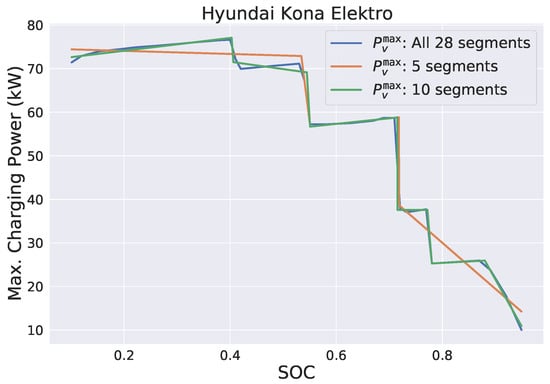 A comparison between the original and these simpler piecewise approximations is shown in Figure 4 exemplarily for the Hyundai Kona Elektro. Observe that the approximation of the original function with 10 segments is already quite good for this rather challenging vehicle type. For of the other vehicle types, see Appendix A.