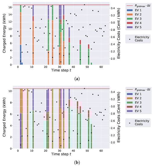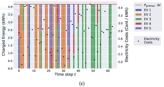 The end of the time horizon is obtained from the last EV’s departure time, i.e., . Electricity costs per unit of consumed energy are independently chosen for each time step uniformly at random from cent/kWh.