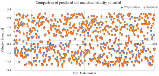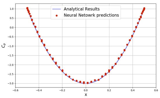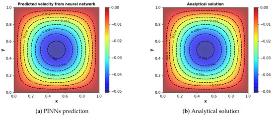 Figure 11a,b, respectively. There is a negligible difference between the neural network predicted results and the analytical solutions. This great consistency showcases the excellent capacity of neural networks for flow predictions.