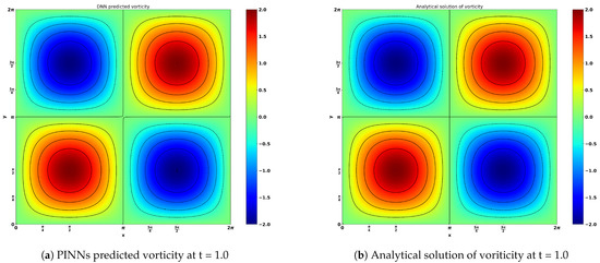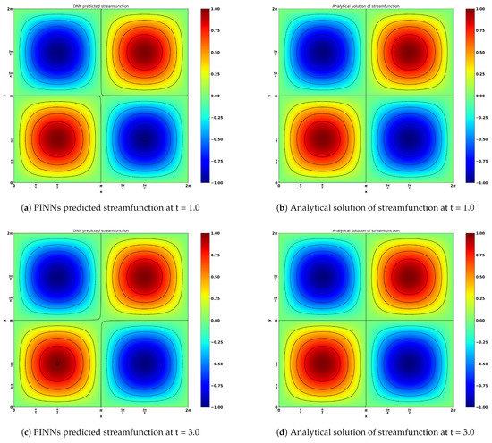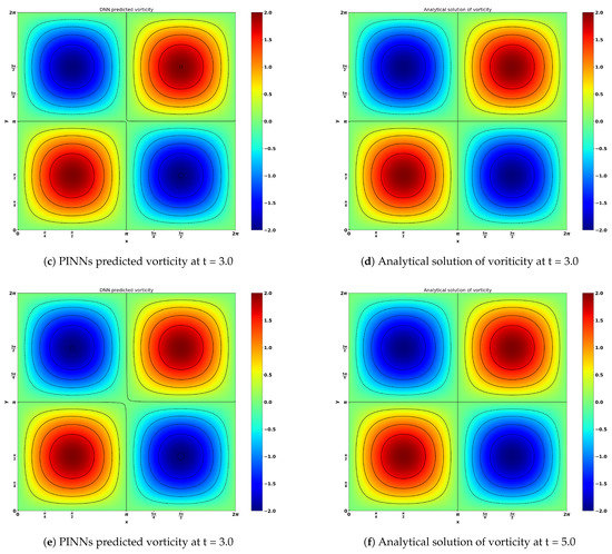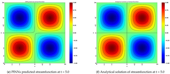 Figure 10 shows the result obtained by neural network predictions and analytical solutions of the viscous Navier–Stokes equation for the Taylor–Green vortex flow. The time evolutions (t = 1.0, 3.0 and 5.0) of the stream function and vorticity are presented in