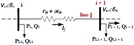 The real and reactive power losses of branch ‘j’ are calculated using Equations (3) and (4) as follows: