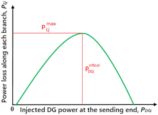 The active power loss along a line increases as the partial derivative of the line loss with respect to the active power injected from DG connected at its sending end bus i rises up to a maximum point as illustrated in the Figure 2. Thus, for any branch/line j, the loss sensitivity factor due to power injected by a DG at its sending end bus i is described as: