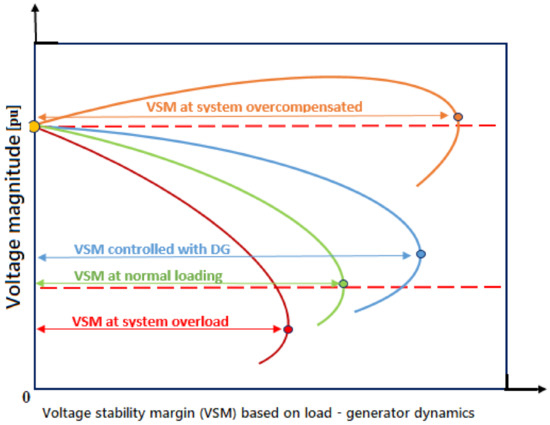 One crucial feature of power system security vis-a-vis voltage stability analysis is the assessment of line voltage stability condition as related to the critical loading limit (stability margin) of the branches. This critical security criterion is defined as the ability to maintain a stable voltage profile under all credible contingencies, i.e., no fault, faulty, fault-cleared, as well as normal load and overload conditions. This is often analyzed as a function of the maximum load increase that the system can withstand without violating its stability expectations. This loading margin can be graphically portrayed by the relationship between the real and reactive loading as shown in the Figure 3. The voltage stability margin can also be a crucial parameter for determining the limit of extra generation that the power system has the capacity to take, especially with the variable renewable DGs, as illustrated in the Figure 4. At a point, though the VSM is enhanced, the system can become overcompensated and this also threatens the power system stability condition.