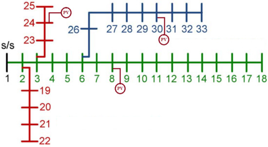 The method proposed in this study is tested on the standard IEEE 33 bus distribution network [59] which is strictly a radial network with no tie line requirement as seen in Figure 5. The system consists of 33 buses/nodes and 32 lines/branches, and it is operated at a voltage of 12.66 kV with a load size of 3.715 MW of active power and 2.300 MVAr of reactive power [6,53]. The location/number of the distributed generation unit is limited to three with total size of about 40% of the total load, in consistent with standard practice as reported in several studies. All simulations reported in this work are performed with the steady-state analysis approach using the load flow methods designed on Matlab.