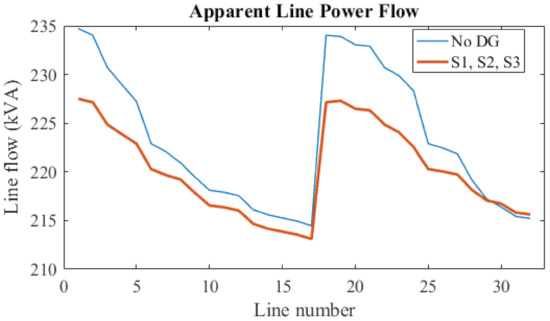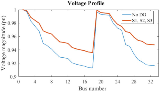 The performance of the approach with respect to the voltage magnitude, line flow and the voltage stability margin is presented in Figure 10, Figure 11 and Figure 12, respectively. The figures show consistency of the proposed DG siting and sizing approach with remarkable improvement in the voltage magnitude, line flow and the voltage stability margin. Not much difference is observed in the results obtained for the three scenarios; however, it is clearly noticed that there is a significant improvement in the distribution network performance using the proposed methods under the three considered scenarios. The significance of this improvement under each scenario is clearly indicated in Table 3 as reflected in the improvement of the minimum bus voltage at bus 18 from 0.9131 pu to 0.9445 pu, 0.9408 pu and 0.9467 pu under the scenario 1, scenario 2 and scenario 3, respectively. The voltage stability margin as measured using CBI shows an improvement of the least CBI value (at line 16) from 0.1591 pu to 0.1702 pu and 0.2311 pu for scenario 2 and 3, respectively while there is a slight reduction in the least CBI value to 0.1492 pu under scenario 1. The trend can be explained by the fact that the formulation of the objective function for scenario 2 and 3 involves CBI maximization directly.