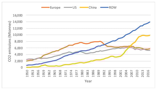 Annual CO2 emissions for Europe, US, China and the rest of the world (Mt) [18].