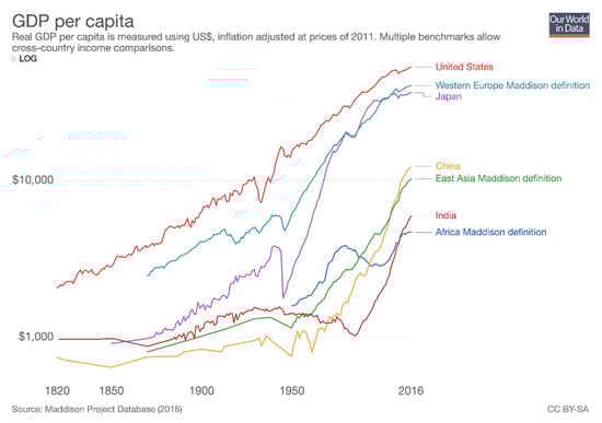 Figure 1 and Figure 2 illustrate the evolution of emission flows and GDP for different regions in the world. It can be observed how the relationship between emission flows and GDP growth has been modified in several regions since the last decades of the twentieth century until now.