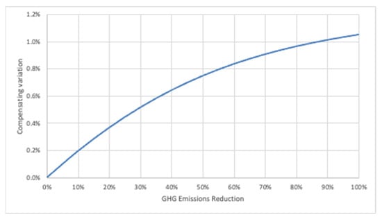 Finally, a very relevant simulation is one in which we increase the reduction in GHG emissions required. Besley and Dixit assumed a 30% reduction, consistent with the Kyoto Protocol. However, the Paris Agreement requires a much larger reduction if we are to comply with the 1.5–2 °C threshold. We have therefore calculated the sensitivity of the willingness to pay for different levels of emissions reductions, which is shown in the following figure.