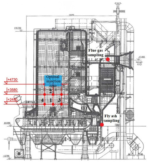 The field tests were carried out in an industrial hot water stoker boiler of 30 MWth capacity, WR-25 type, located in a district heating facility. The boiler scheme with ports of dry sorbent injection is presented in Figure 1. Powdery sorbents can be injected by ports located at three levels of 2480, 3580 and 4730 mm above the grate. Ports 1–4 were used for in-furnace temperature measurement to determine the optimal sorbent injection zone.