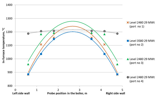 The research presented in this study was carried out in a municipal heating plant; therefore, the operating conditions were strictly dependent on the municipal heat demand. For presented tests, the in-furnace temperature was determined for maximum boiler output of 29 MWth via ports no 1–4 according to Figure 1. The results of the corrected in-furnace temperature measurements are given in Figure 2.