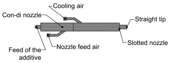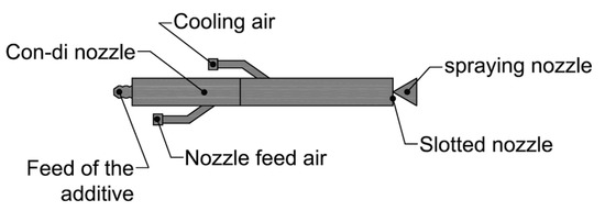The presented technology can be successfully used for the injection of a wide range of powdery sorbents (combustion additives). The installation includes sorbent (additive) tanks, from which the sorbent is pneumatically transported through process lines to the furnace chamber or exhaust duct using a dosing nozzle. The nozzle has a cooling air duct to protect the material from overheating. Ports for dosing the sorbent to the combustion chamber are located in the existing openings of the boiler walls. The block diagram of the system is shown in Figure 3. The powdery sorbent was distributed into the combustion furnace by ejector nozzles (2 to 4 units) supplied with compressed air and illustrated in Figure 4 and Figure 5. For proper operation of the system, it is necessary to use dehumidified compressed air at a pressure of at least 3 bar.