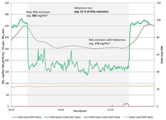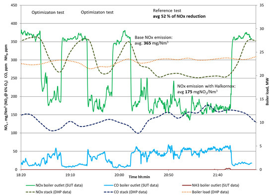 The reference test confirmed the efficiency of the dry SNCR method. Before the reference test, optimization tests were performed to obtain the highest possible performance in terms of NOx and ammonia slip reduction. In every case, the NOx emission was monitored by both DHP and SUT equipment. The results of emission measurements during the optimization and reference tests are presented collectively in Figure 6. All emission data are given at 6% O2.