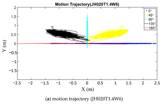 Figure 11 shows the motion trajectory of the floating platform under normal sea conditions and extreme sea conditions. It was concentrated in a single direction when the wave and wind directions were 0°, 90°, and 180°. When the wave and wind directions were 45° and 135°, the moving area of the floating platform was about 2 m2. When the wave wind angle was 90°, the platform moved close to the y-direction about 0.2 m, and the moving area was about 0.9 m2. There was a maximum moving range of about 4.1 m when the wave and wind directions were 0°.