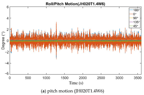 Figure 12, Figure 13 and Figure 14 are time series of the surge, heave, and pitch motions of the floating platform under normal sea conditions and extreme sea conditions. In normal sea conditions, the average response amplitude in the surge was almost the same, but different phases were presented with the change in wave and wind directions. There was a maximum response amplitude in heave and pitch when wave and wind directions were 0°, and it decreased as the wind direction changed from 0° to 180°. In normal sea conditions, the platform in different wave directions was about 1 m for surge amplitude, ±0.03 m for heave motion, and ±2° for pitch motion.