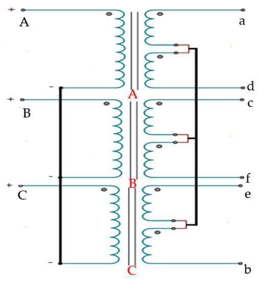 Three different transformers A, B, and C are built, each having one primary coil and two secondary coils; the three coils of the primaries are star-connected, while the six coils of the secondary side are coupled in a unique way to produce a star output. Figure 1 depicts the connection schematic of the primary and secondary windings to produce a three-phase star in primary and a six-phase star connected in secondary.