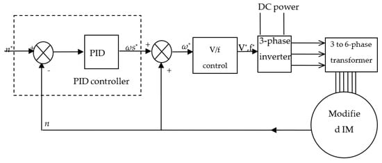 The speed control V/F closed-loop type is distinguished by its good accuracy and simplicity of tracking the reference speed [47,48,49]. The proposed PID control strategy is used to emulate a closed-loop controller to maintain the modified six phases IM following the reference speed. Figure 4 shows the schematic diagram of the proposed scalar control (V/F) system of a three-phase inverter fed to a three-to-six phase transformer loaded by the six-phase IM. The slip speed instruction is generated by the speed loop fault through the proportional–integral controller and limiter. The slip frequency ω* instruction is created by adding the slip speed ωs* to the rotor speed. The voltage references are generated by the slip frequency references using a V/F calculation. The slip frequency ω* is increased, resulting in a positive error, and the slip speed ωs* is adjusted to its maximum. The increase of slip frequency ω* giving a positive error and slip speed ωs* is adjusted at its maximum. The motor accelerates at the maximum inverter current, delivering the maximum torque feasible, to reduce the speed error to minimum value. Finally, the inverter is steady on a slip speed where the load torques and motor torque are equal. The decrease of slip frequency ω* giving a negative error and slip speed ωs* is adjusted at its maximum negative. The motor decelerates at the maximum inverter current, delivering the maximum braking torque feasible, to reduce the speed error to minimum value. Finally, the inverter is steady on a slip speed where the load torques and motor torque are equals.