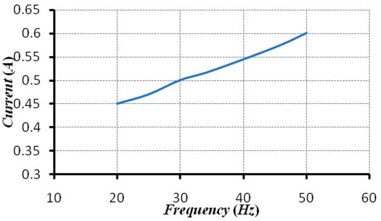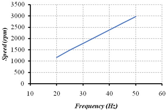 Figure 13, Figure 14, Figure 15, Figure 16 and Figure 17 show the experimental reading of the system under study using the electrical break as a centrifugal pump. Figure 13 shows the experimental relationship between voltage and frequency, in the range of 64.3–156 volts, that corresponds to 20–50 Hz frequency variation. Figure 14 and Figure 15 show the inverter frequency’s experimental value of stator input current, and rotor speed changes.