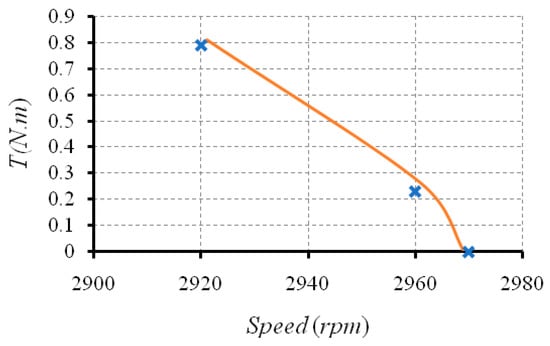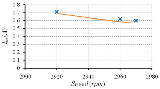 Figure 16 and Figure 17 show simulation and experimental load torque values and input current as rotor speed changes. These figures indicate that the simulated values are well-matched and agree with their measured values. On the other hand, the small difference between the simulation values and the experimental results is owed to the consideration that the simulation of the system under study is assumed to be accurate at all operating ranges. The error between the measured and calculated values of mechanical torque ranges from 2.4 to 12.4%, while the error between the measured and calculated values of the stator current ranges from 2.3 to 6.3%, which indicates a convergence between the proposed practical model and the equivalent mathematical model.