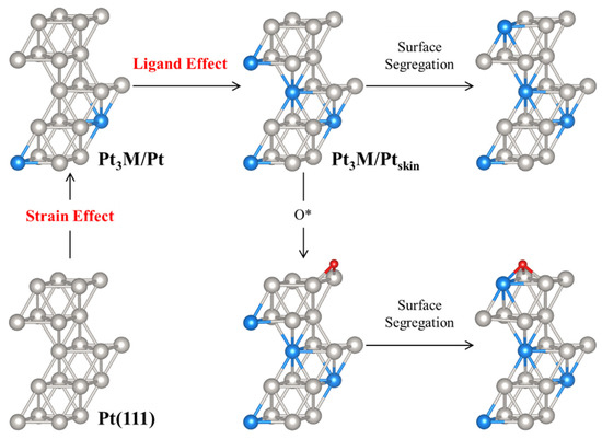 One way to improve catalytic activity and reduce costs is by lowering the noble metal content through alloying, in which two or more guest atoms are introduced and mixed into an existing metal catalyst [16,17,18]. By alloying, the catalytic properties, such as the core structure, lattice distance, chemical properties of the surface, chemical composition of the ensemble, and surface atomic coordination, are changed, which greatly affects the activity and stability of the catalysts [19]. Among these property changes, the three factors that have the greatest influence are (1) strain effect (change in the lattice distance of the core), (2) ligand effect (change in chemical properties of the atoms on the surface), and (3) ensemble effect (change in catalytic properties of an ensemble of atoms on the surface) [20,21,22,23]. In actual alloy catalysts, these three effects appear mixed together, making it difficult to distinguish them separately. However, it is possible to clearly examine each effect using first-principles investigations, and it can provide insight to other researchers because the origin of the enhanced reactivity can be apparently identified.