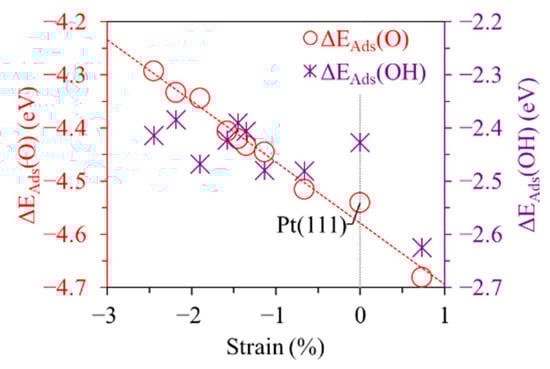 Changes in adsorption energy of OER/ORR intermediates due to the strain effect.