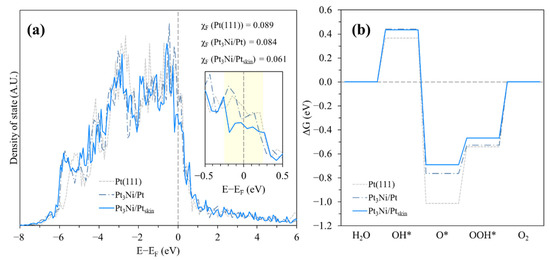 To better understand the origin of the enhanced activity, we calculated the surface electronic structure. In Figure 5a, we plot the partial density of states (PDOS) of surface Pt. The PDOS shapes of the catalytic surfaces of Pt3Ni/Pt and Pt3Ni/Ptskin are similar to that of Pt(111). However, near the Fermi level (E − EF ≈ 0 eV), we found that the PDOS on the Pt3Ni/Pt surface was slightly reduced compared to the Pt(111) catalysts, and the PDOS level of Pt3Ni/Ptskin was clearly reduced compared to the Pt(111) and Pt3Ni/Pt catalysts.